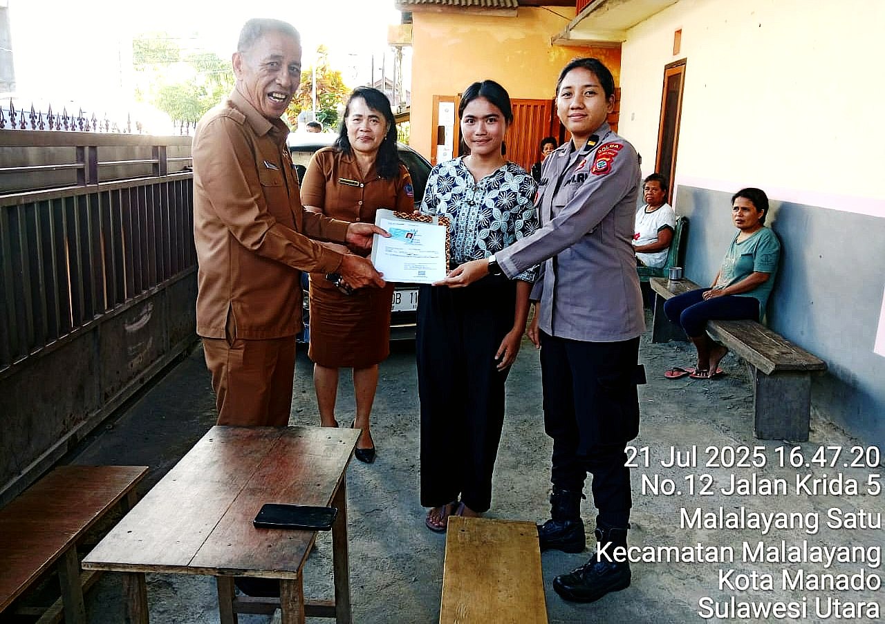 Menindaklanjuti kondisi tersebut, Kepala Dinas Dukcapil-KB Sulut, Christodharma Sondakh, didampingi Kabid Dukcapil Jeane Wowor menyerahkan langsung dokumen berupa Kartu Tanda Penduduk (KTP), Kartu Keluarga (KK), dan Akta Kelahiran kepada Angela di tempat kost-nya di Nomor 12 Jalan Krida 5, Kelurahan Malalayang Satu, Kecamatan Malalayang, Kota Manado, Senin (21/7/2025).